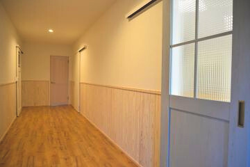 廊下にはやさしい木目の腰壁を取り入れ、あたたかみのある空間になりました。 扉のデザインもかわいらしく、やさしい雰囲気の廊下に仕上がっています!